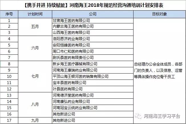 2017年以來(lái),河南海王投資并購(gòu)步伐逐漸加快,公司規(guī)模不斷擴(kuò)大,業(yè)績(jī)?nèi)〉蔑@著成果。但在快速發(fā)展的同時(shí),總裁楊拴成對(duì)集團(tuán)整體經(jīng)營(yíng)作出更高要求,即“業(yè)務(wù)”和“管理”要兩手抓,兩手都要硬。 為全面落實(shí)總裁要求,提高溝通效率,促進(jìn)集團(tuán)與分子公司業(yè)務(wù)融合;同時(shí)導(dǎo)入規(guī)范化經(jīng)營(yíng)管理體系,為分子公司解決相關(guān)問(wèn)題,有效規(guī)避經(jīng)營(yíng)風(fēng)險(xiǎn)。集團(tuán)人力資源部從5月份開始,聯(lián)合集團(tuán)各部門,分期赴各分子公司,組織開展河南海王2018規(guī)范經(jīng)營(yíng)溝通培訓(xùn)。
